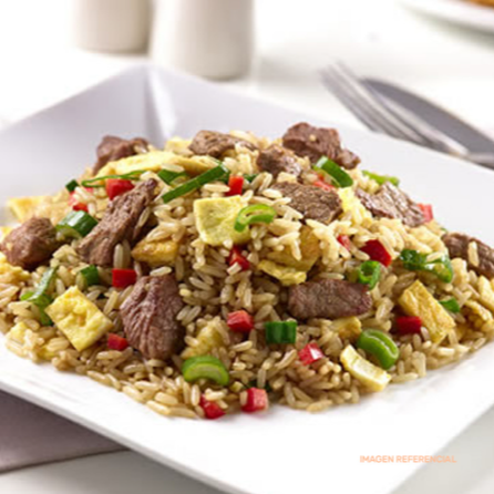 Chaufa de carne: arroz frito al wok con jugosos trozos de res, huevo, cebolla china y un toque de sillao. ¡sabor intenso y tradición peruana en cada bocado!