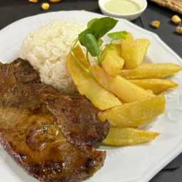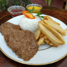 Delicioso bistec frito acompañado de arroz y papas fritas