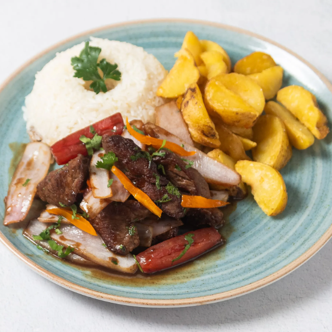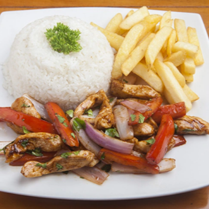 Pollo saltado: trozos de pollo jugoso salteados al wok con cebolla, tomate y un toque de sillao, acompañado de arroz blanco y papas fritas crocantes. ¡sabor peruano que conquista!