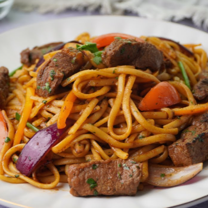Tallarín saltado de carne: fideos salteados al wok con jugosos trozos de res, cebolla, tomate y un toque de sillao. ¡un clásico peruano lleno de sabor y tradición!