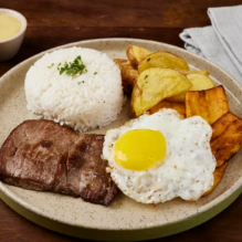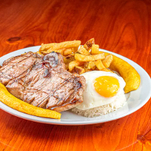 Delicioso bistec a lo pobre, acompañado de arroz, plátano y huevo frito