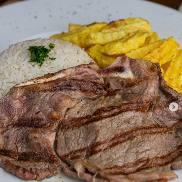 Carne de res a la plancha (churrasco), servida con arroz blanco y papas fritas