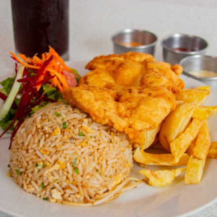 Delicioso pollo crocante acompañado de chaufa y papas fritas.