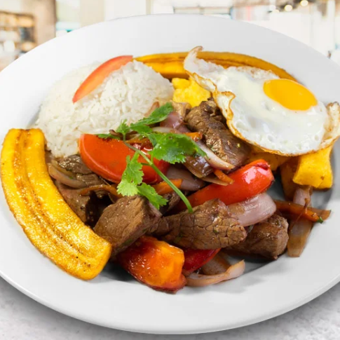 Lomo saltado a lo pobre con arroz, platano y huevo frito