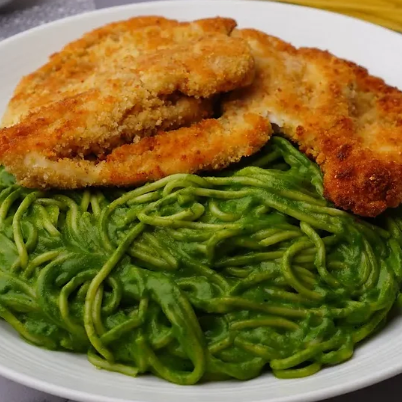 Pasta fresca bañada en salsa de espinaca y albahaca cremosa y sabrosa, acompañada de una milanesa de pollo crocante por fuera y jugosa por dentro un clásico irresistible.