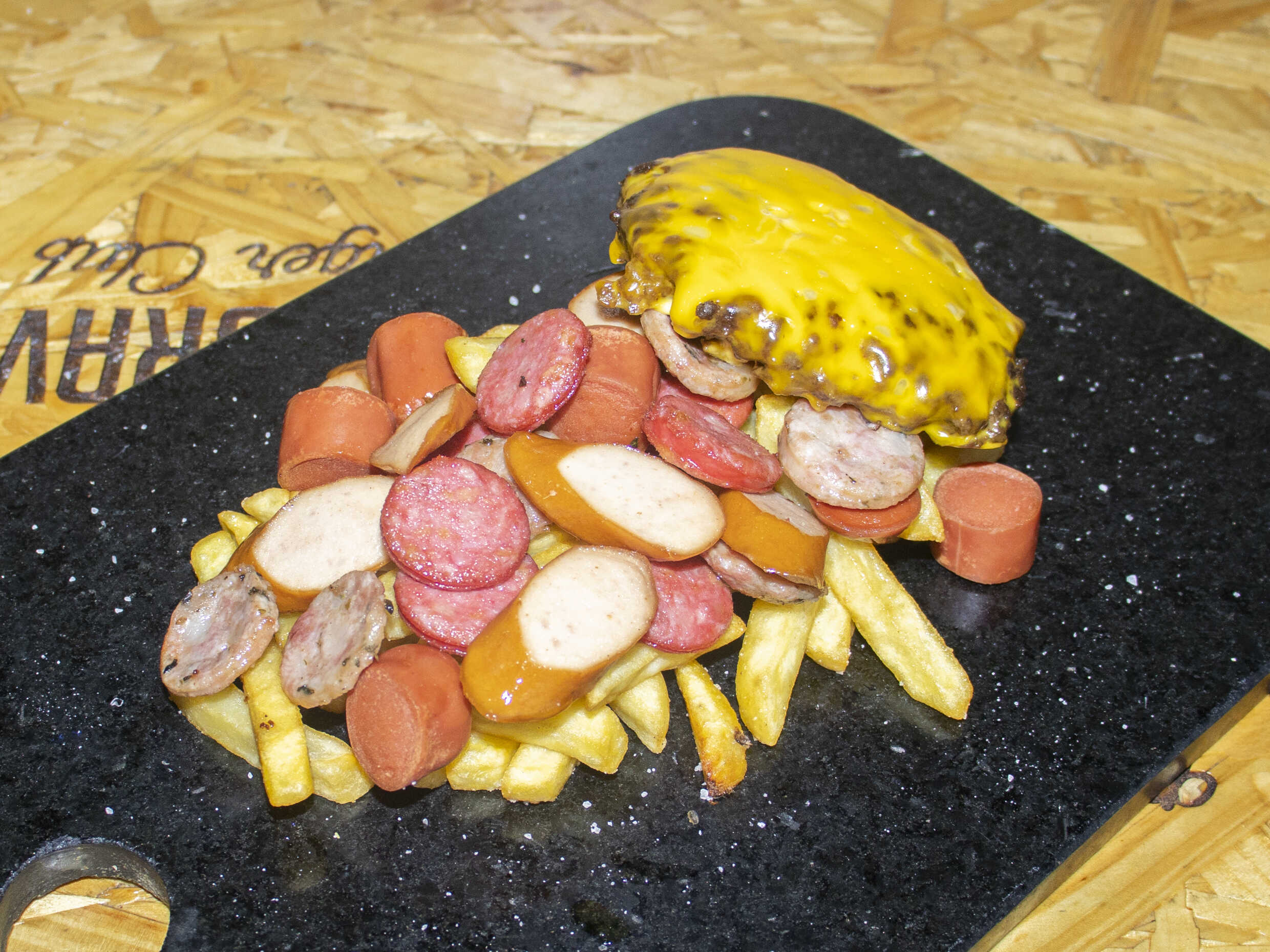 Papas crocantes, salchicha frankfurter, chorizo parrillero, chorizo finas hierbas, salchicha vienesa, pieza burger artesanal y queso cheddar.