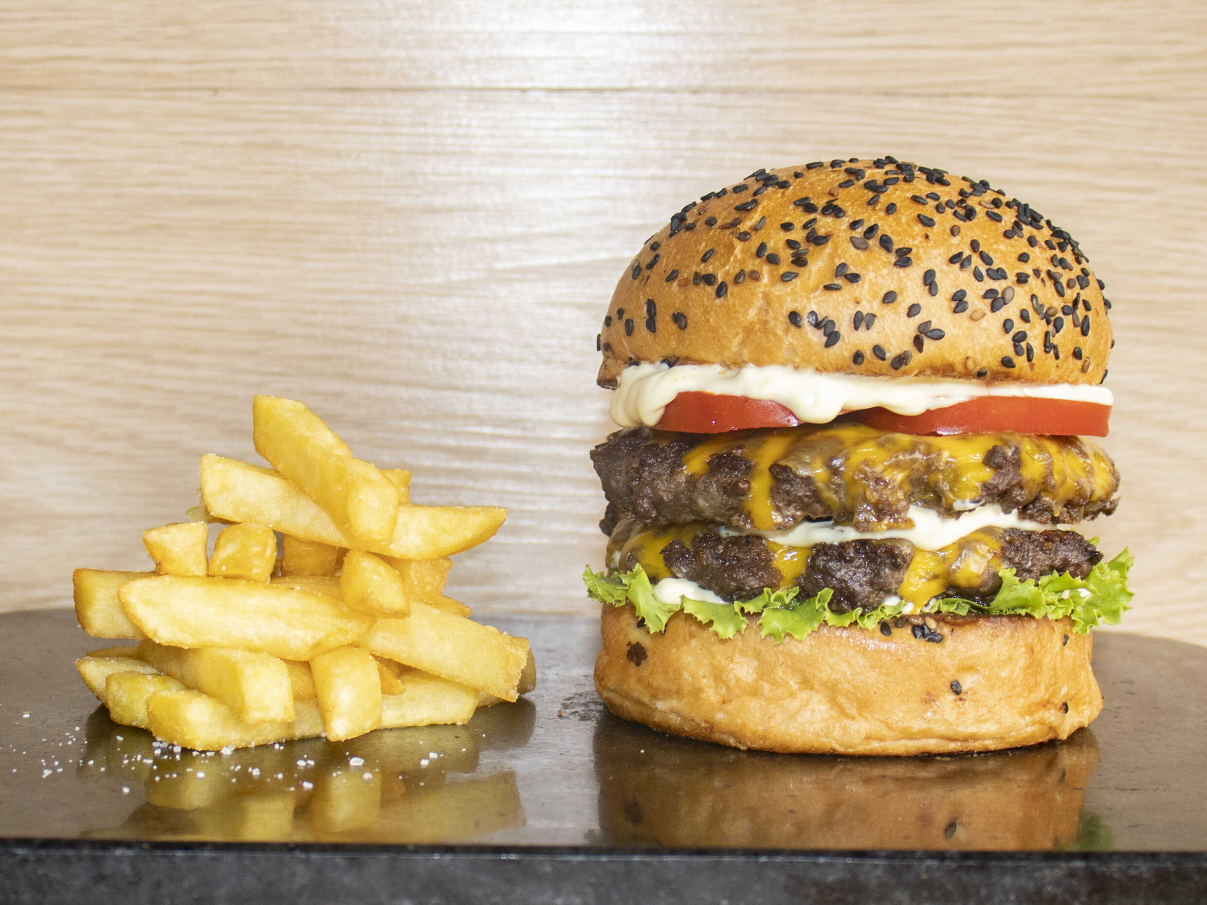 Doble hamburguesa 100 % de res premium, doble queso cheddar, pan brioche artesanal, lechuga, tomate y mayonesa.
