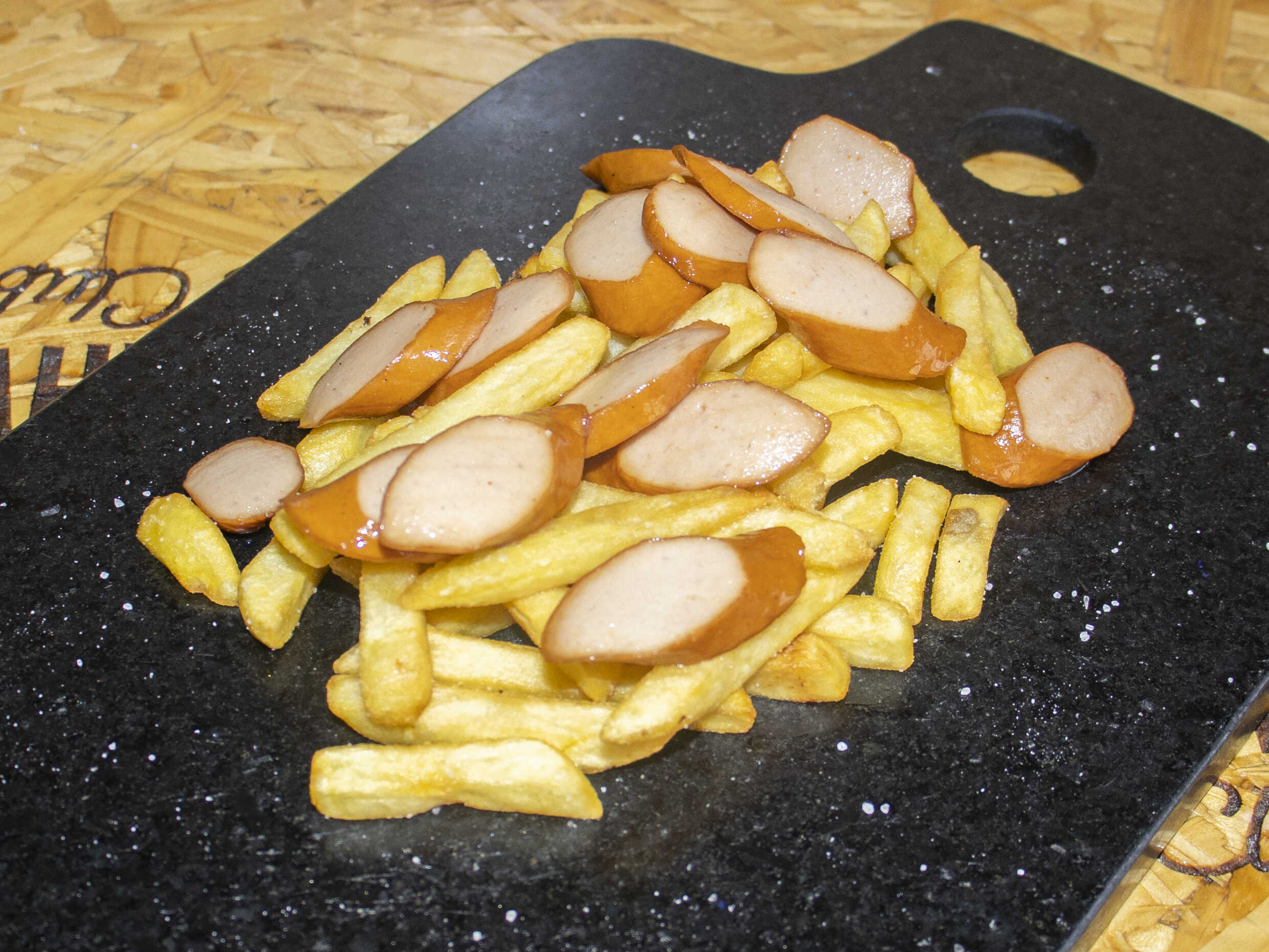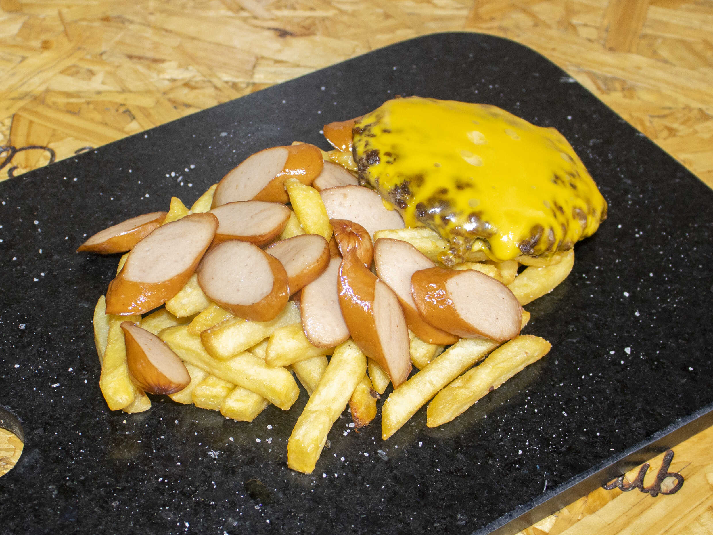 Papas crocantes, salchicha frankfurter, pieza de hamburguesa artesanal y queso cheddar.