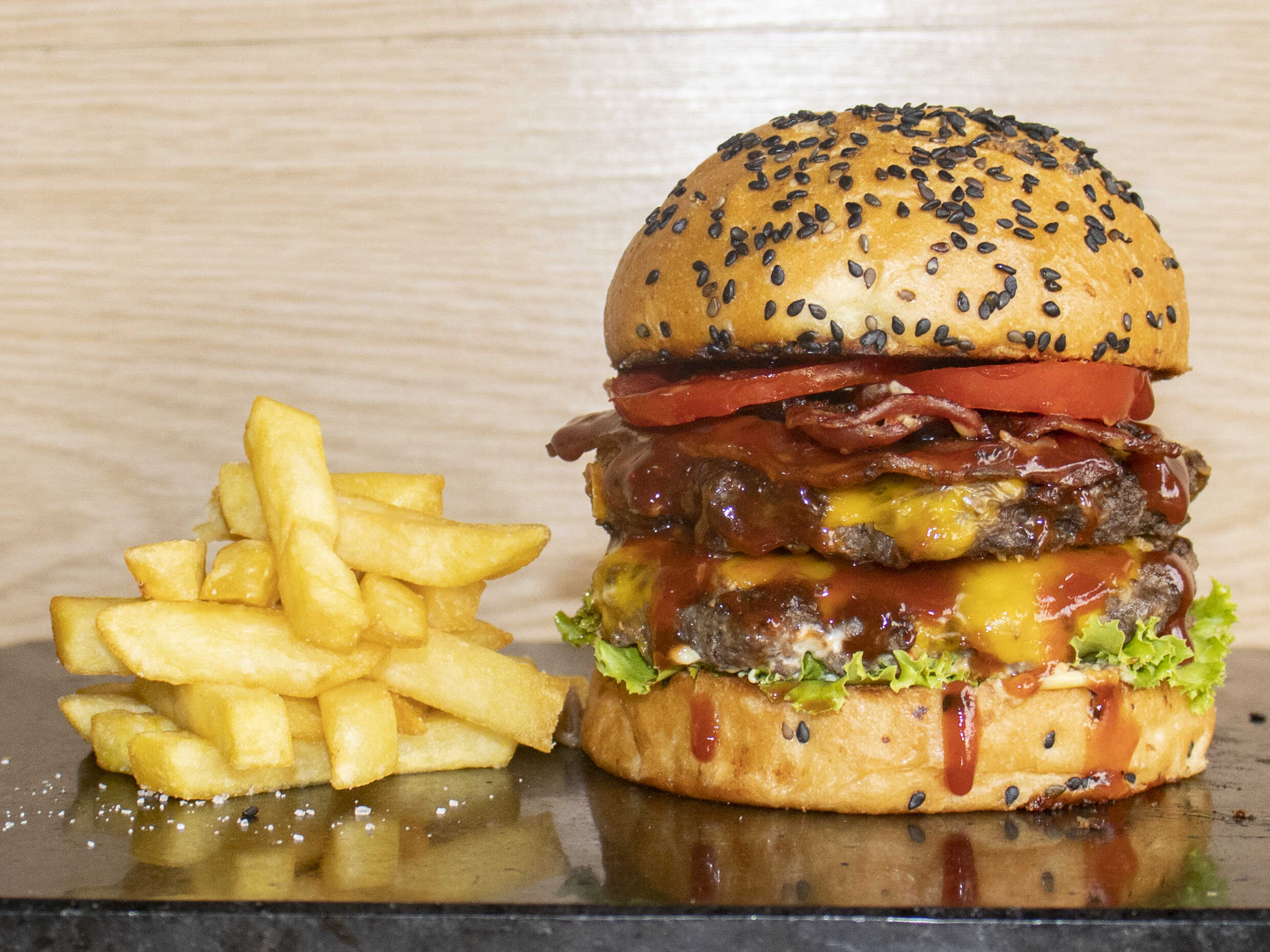 Doble hamburguesa 100 % res premium, doble queso cheddar, tocino, salsa BBQ, pan brioche artesanal, lechuga, tomate y mayonesa.