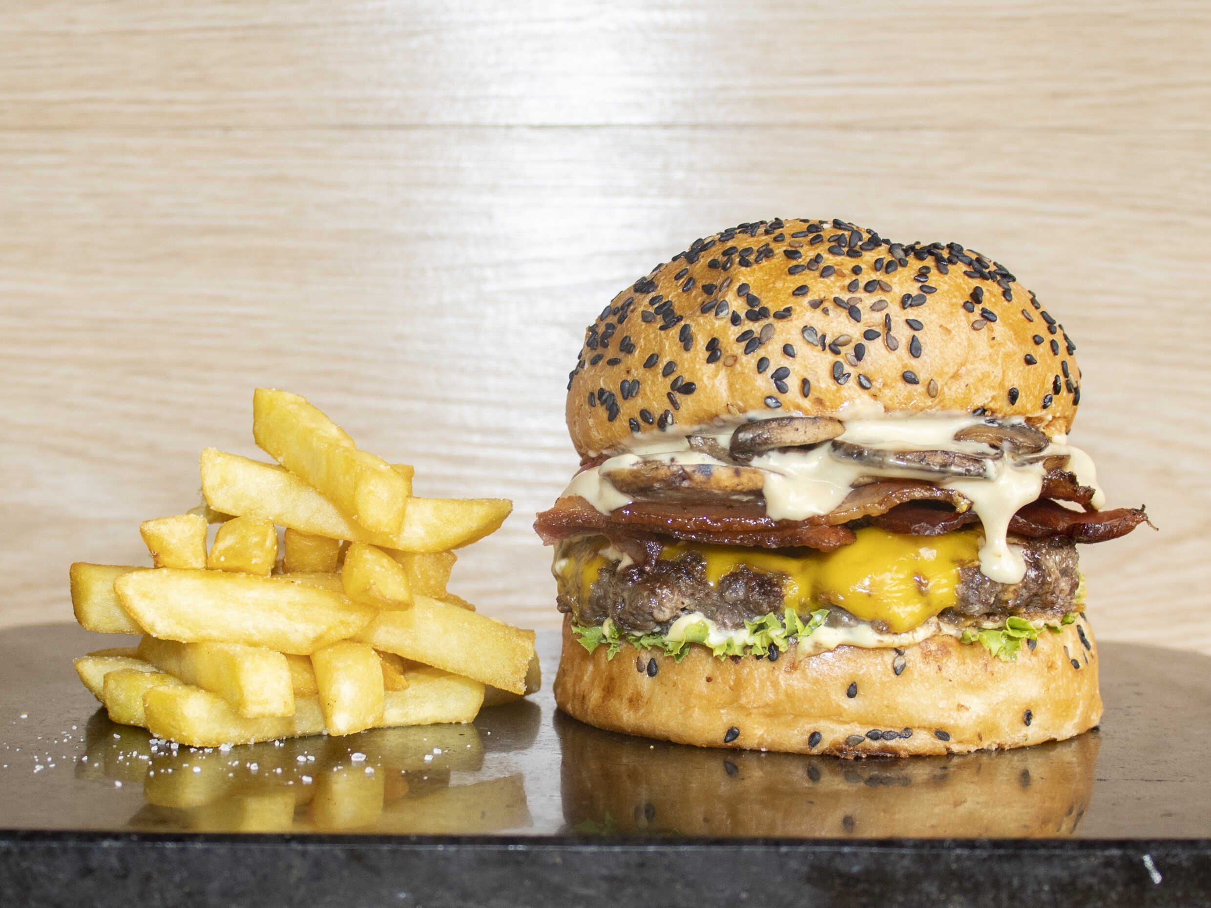 Carne 100 % de res premium, queso cheddar, salsa honey, champiñones, tocino, pan brioche artesanal, lechuga, tomate y mayonesa.