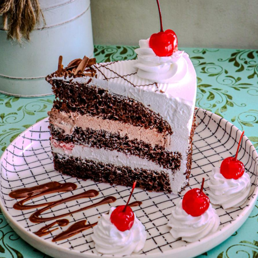 Clásico pastel en porción individual, con esponjoso bizcocho de chocolate y salsa de fresa.