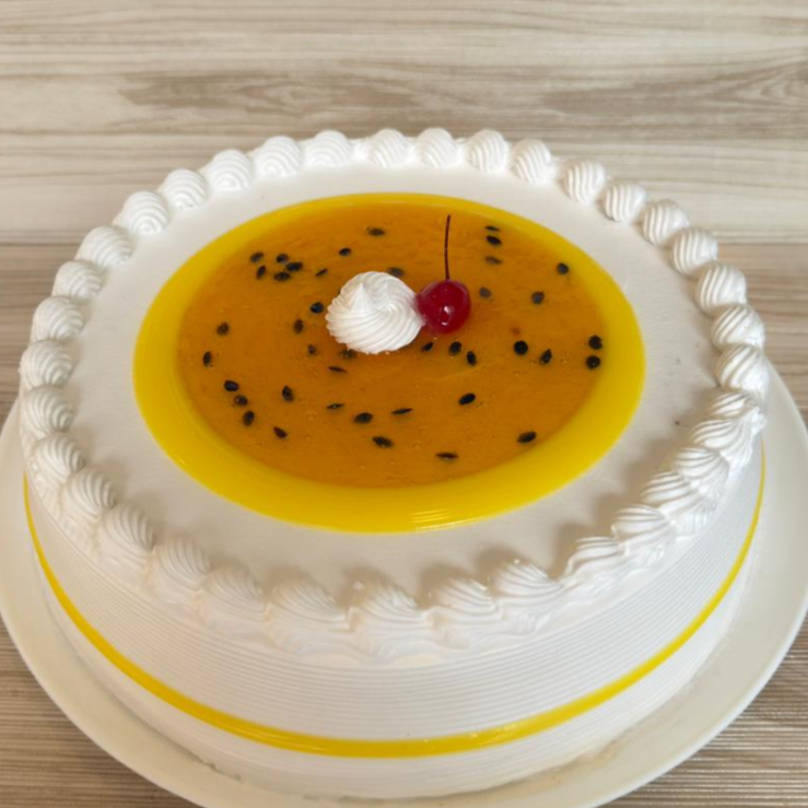 Bizcochuelo embebido en jarabe de tres leches, con relleno de maracuyá y decorada con salsa de maracuyá.