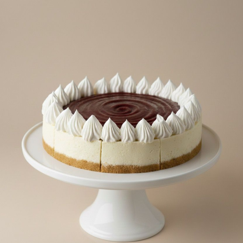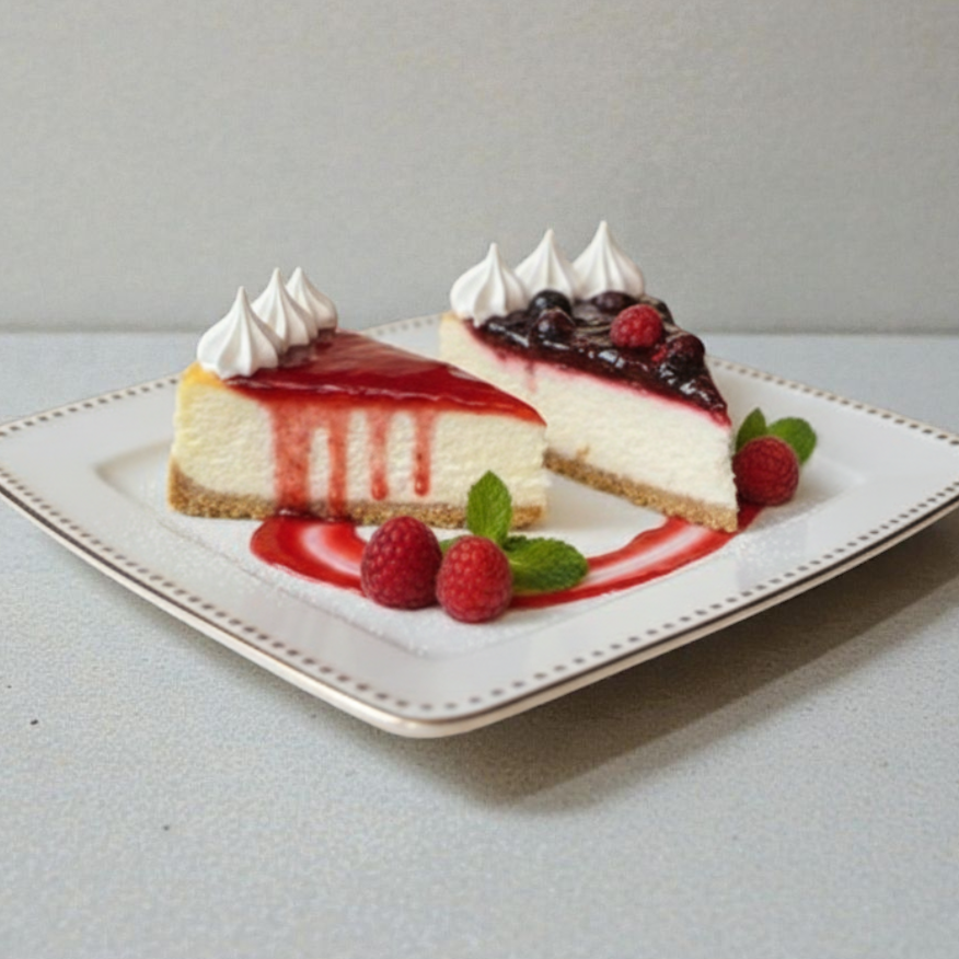Base crujiente de galleta de vainilla, suave mousse de queso crema, cubierto con salsa de frutos del bosque.