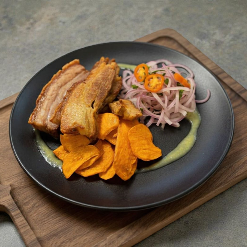 Sabrosos trozos de panceta dorada, acompañados de camote frito y sarsa criolla, servida con café o infusión.