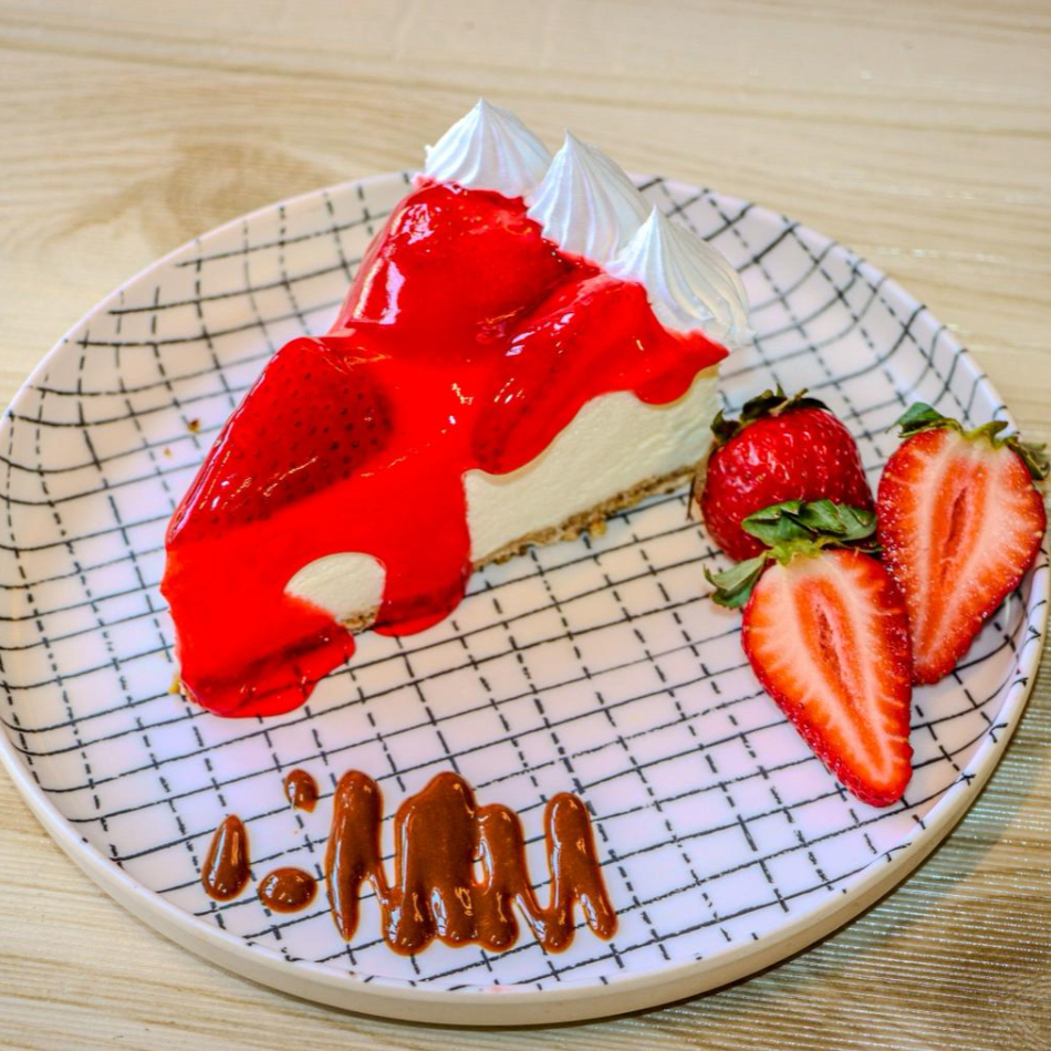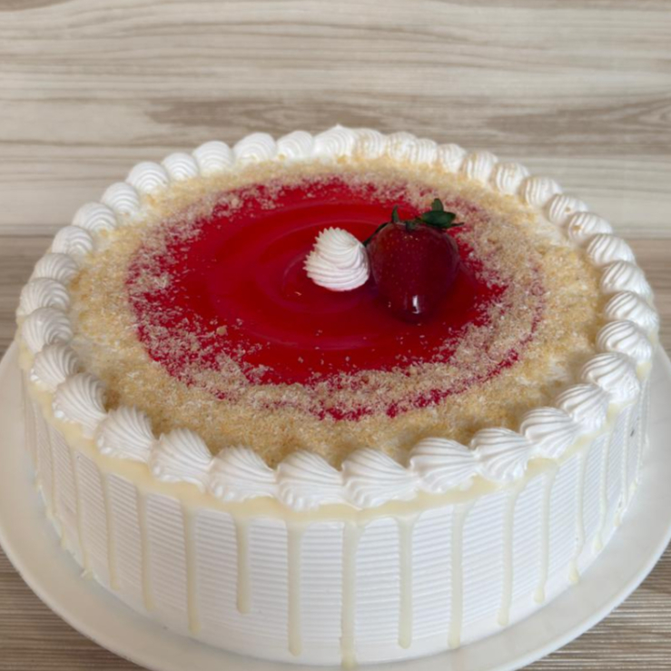 Bizcochuelo embebido en jarabe de tres leches, relleno de fresa con cobertura saborizada de fresa.