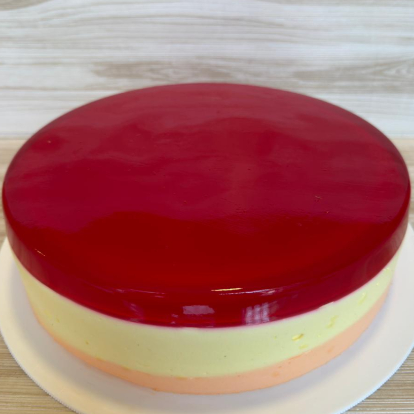 Gelatina de fresa con bizcochuelo y unas deliciosas capas de mousse sabor piña y naranja.