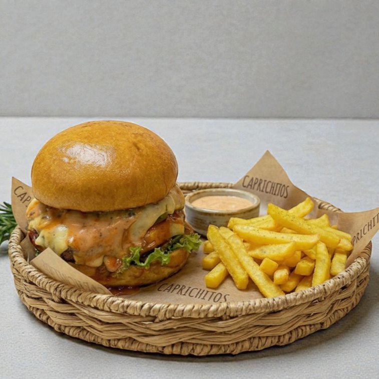 Jugosas hamburguesas con doble queso, lechuga fresca, tomate y un toque de salsa bbq, servida con papas fritas doradas.