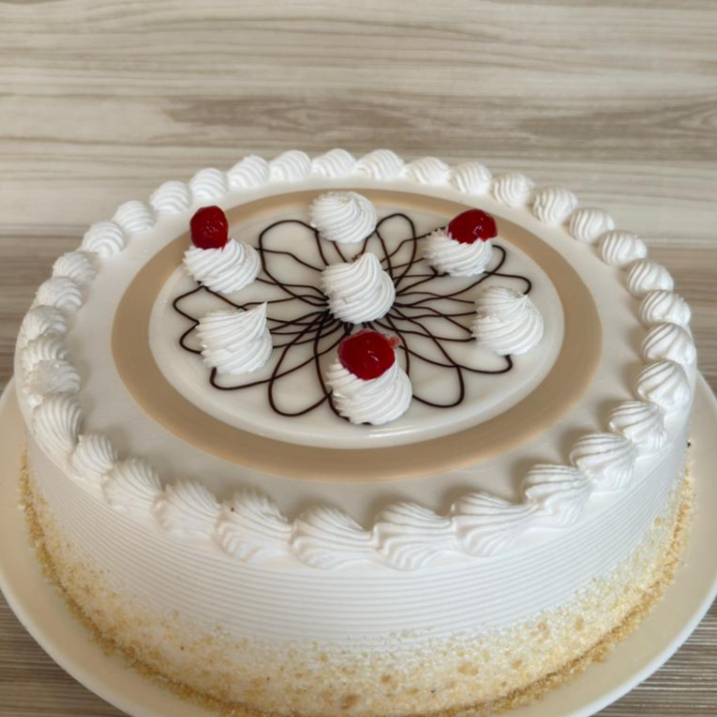 Bizcochuelo de colores sabor a vainilla, relleno de frosting y cubierta de chantilly.