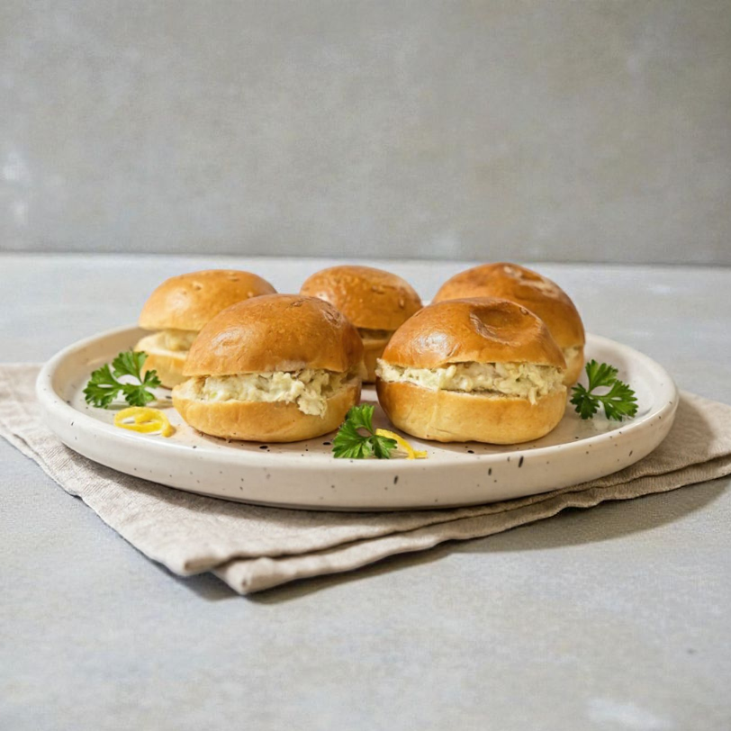 Bocaditos rellenos con suave pollo desmenuzado y un toque de mayonesa casera, servido en pan fresco y esponjoso.