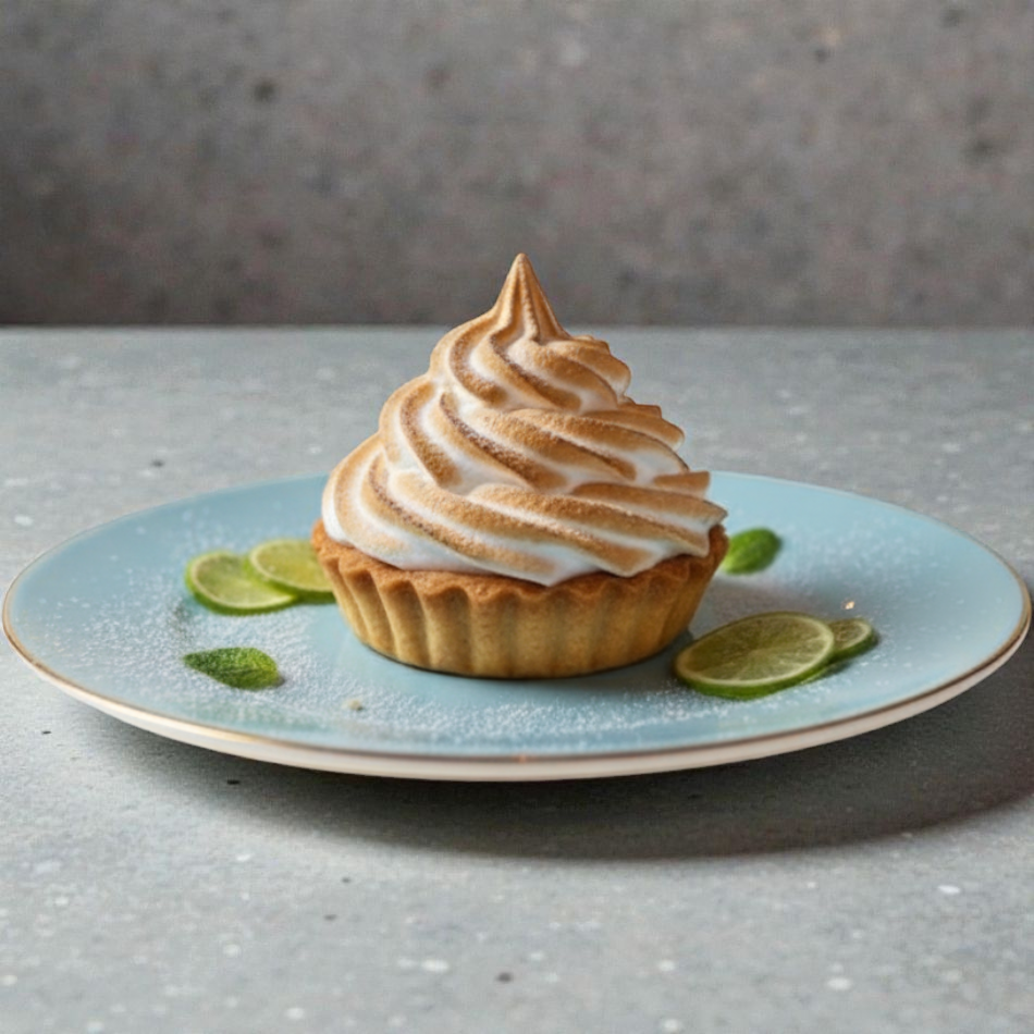 Suave crema de limón sobre una base crocante de galleta, coronada con merengue dorado.