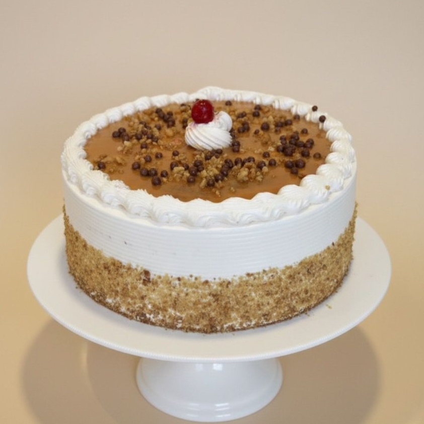 Queque de vainilla, relleno con crema de toffee y salsa de toffee.