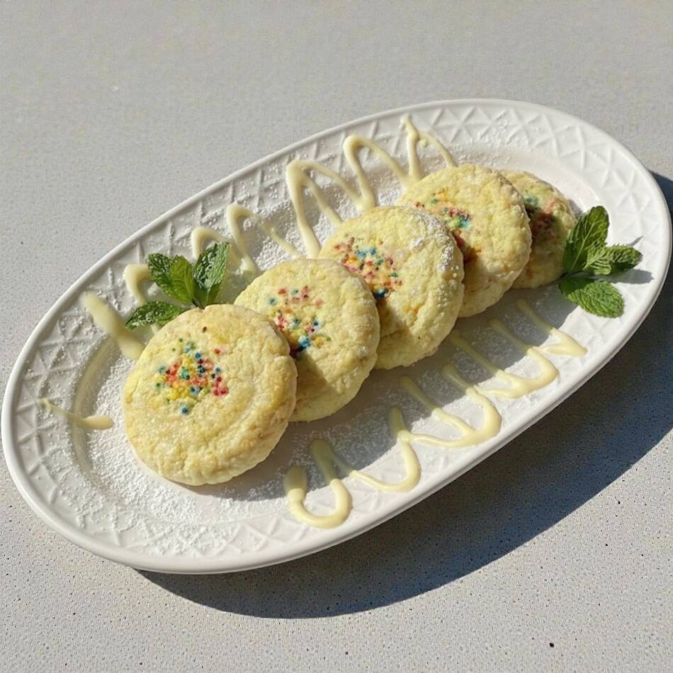 Delicadas galletitas con suave textura y un sutil toque de vainilla , decoradas con finas hojuelas de colores.