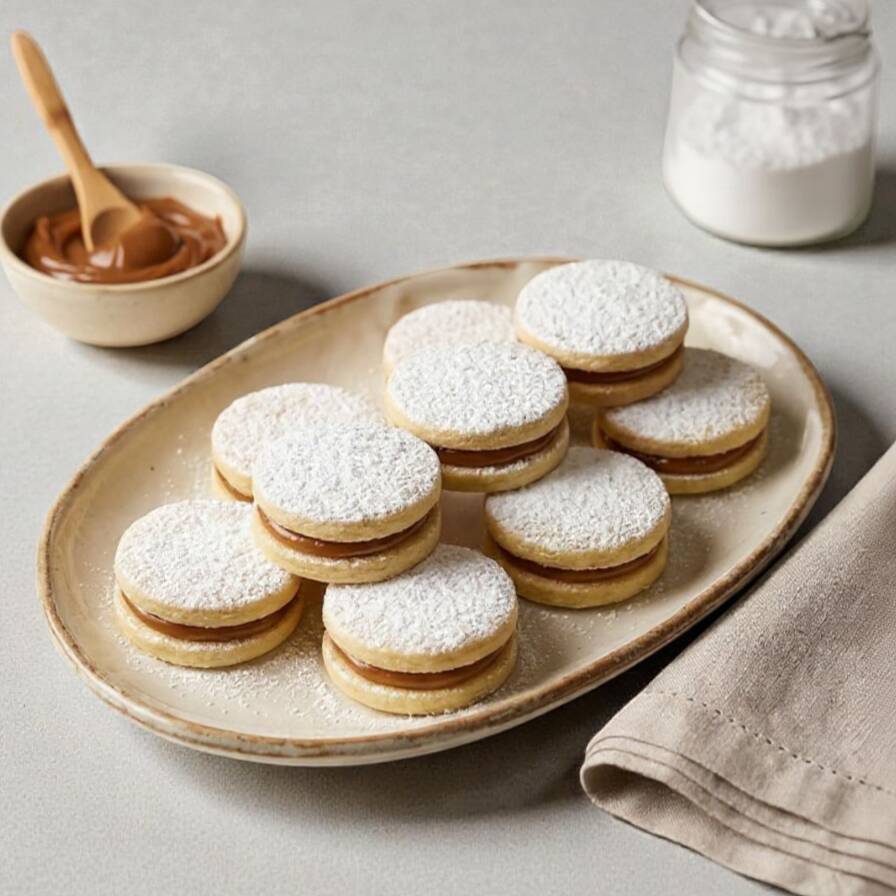 Finas galletitas de maicena con suave manjar blanco y espolvoreadas con azúcar en polvo.