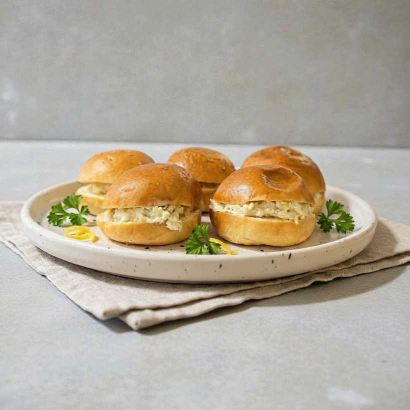 Bocaditos rellenos con suave pollo desmenuzado y un toque de mayonesa casera, servido en pan fresco y esponjoso.