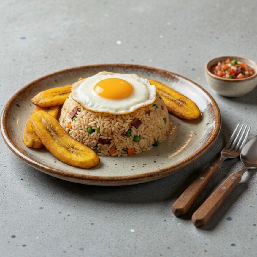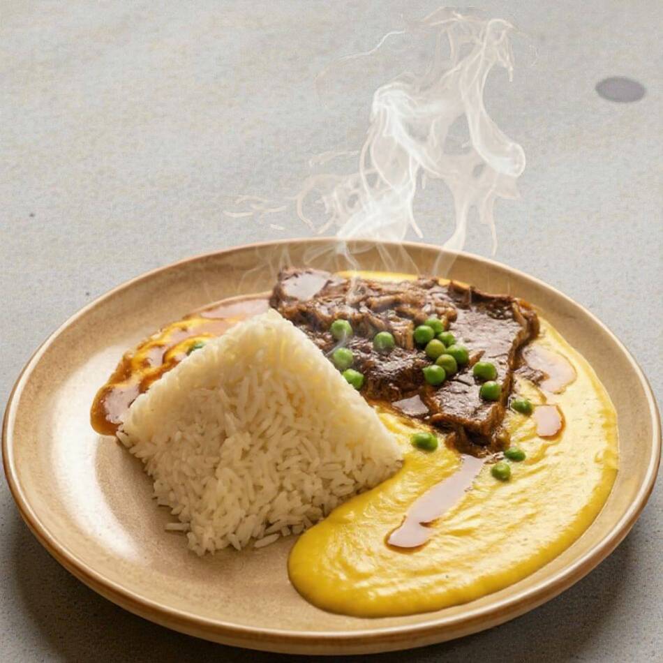 Exquisito arroz blanco moldeado y un sabroso relleno de carne guisada, acompañada de plátano y huevo.