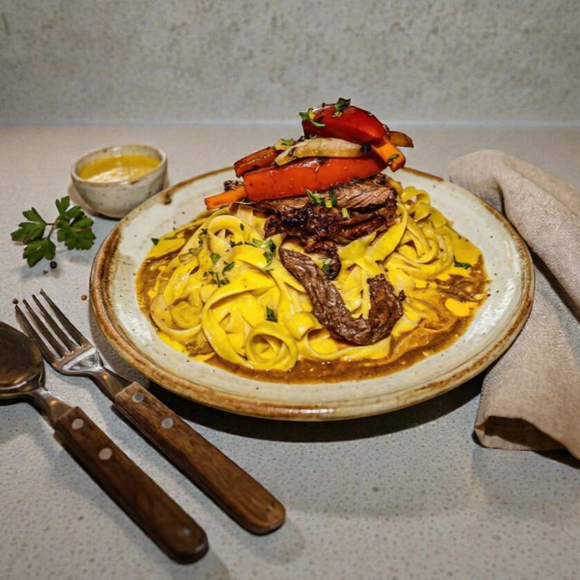 Pasta jugosa en salsa huancaína, acompañado de un delicioso lomo saltado ahumado.
