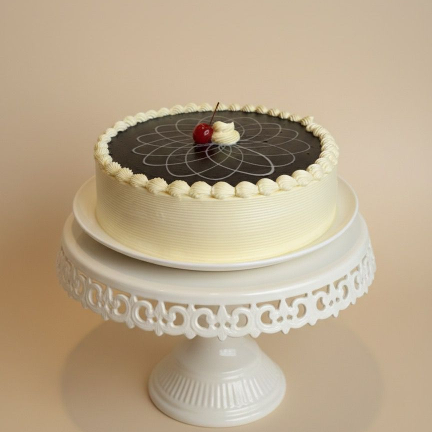 Queque de chocolate con doble relleno de fudge, decorado con cerezas y moños de manjar blanco.