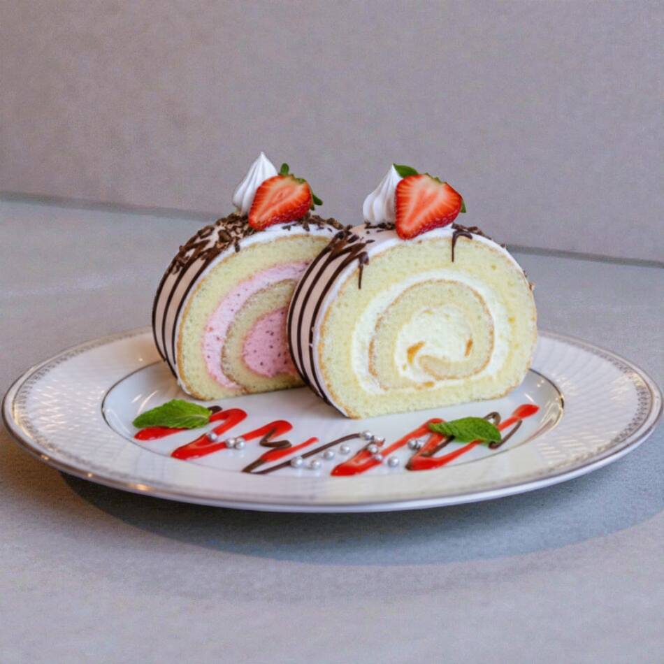 Suave rollo de bizcocho, relleno con una combinación fresca a su elección.