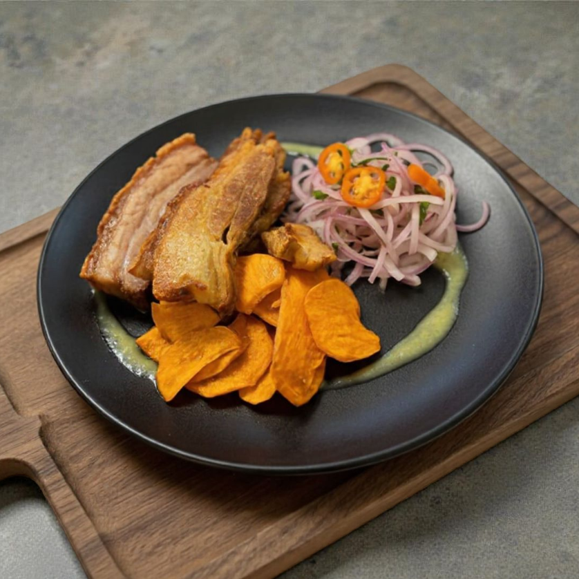 Sabrosos trozos de panceta dorada, acompañados de camote frito y sarsa criolla, servida con café o infusión.