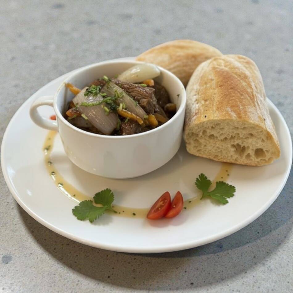Pan ciabatta con jugoso lomo salteado al estilo peruano, acompañado de cebolla y tomate.