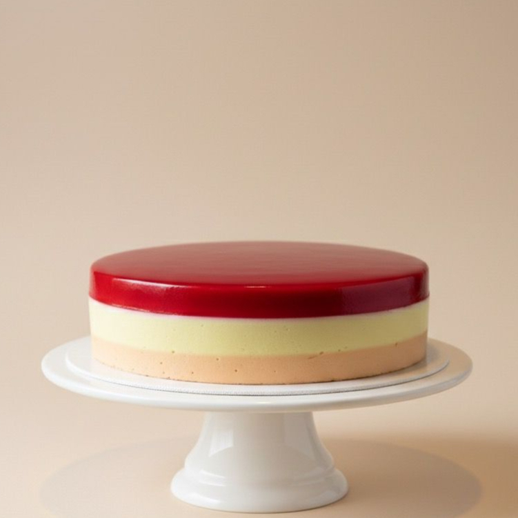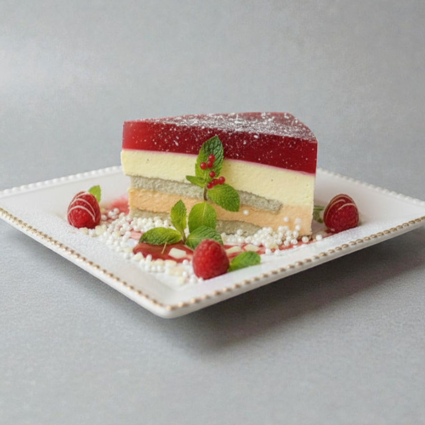 Gelatina de fresa con bizcochuelo y unas deliciosas capas de mousse sabor piña y naranja.