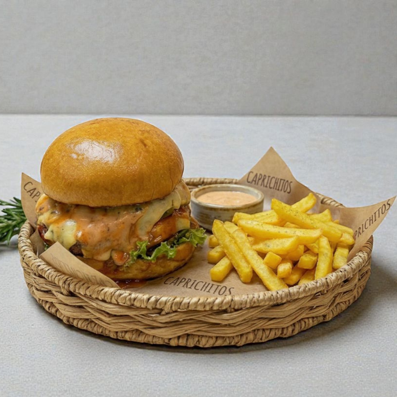 Deliciosa hamburguesa con jugosa carne, queso derretido, lechuga fresca, tomate y servida con papas fritas doradas.