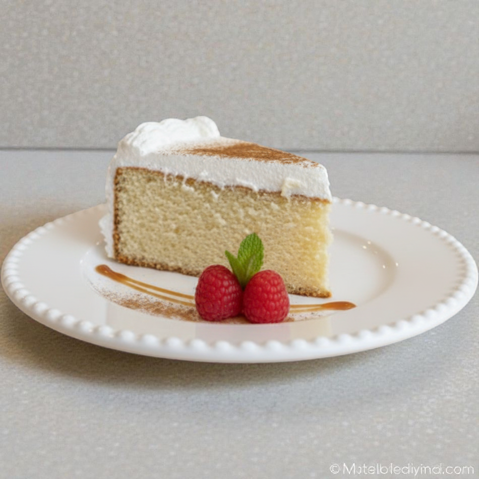 Bizcochuelo embebido en jarabe de leche, sabor a coco y cubierto con chantilly.