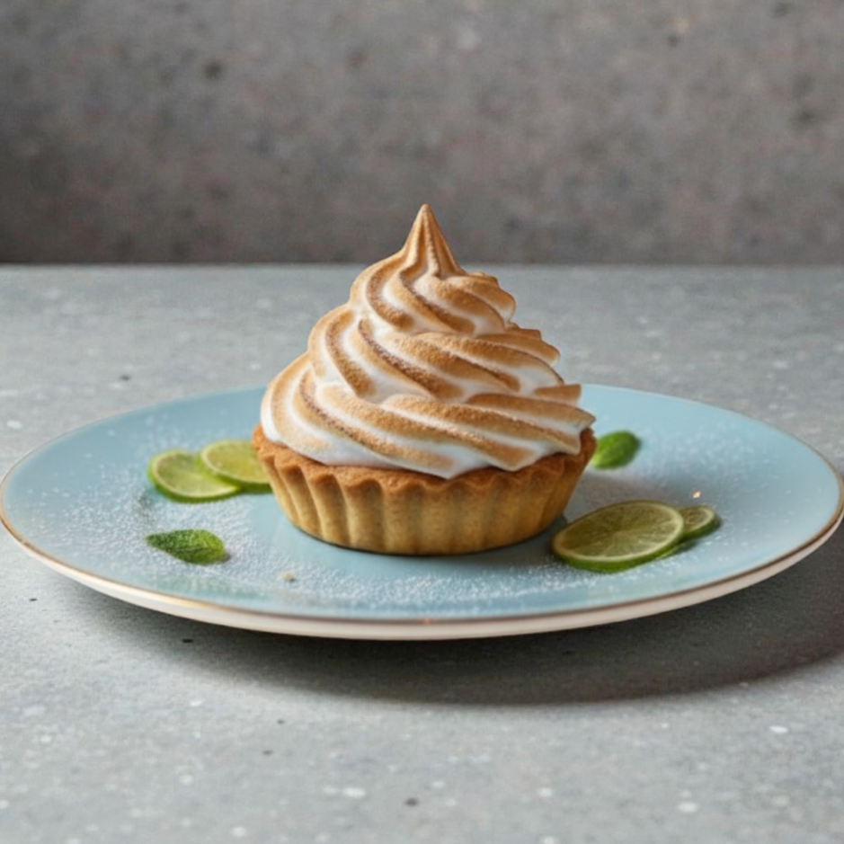 Suave crema de limón sobre una base crocante de galleta, coronada con merengue dorado.