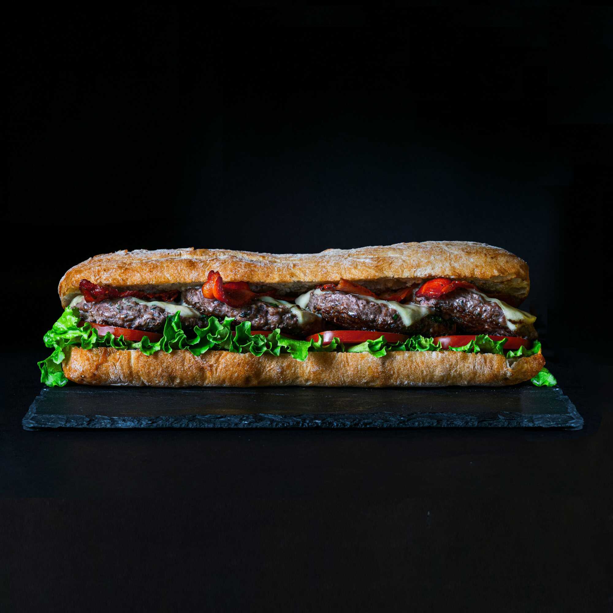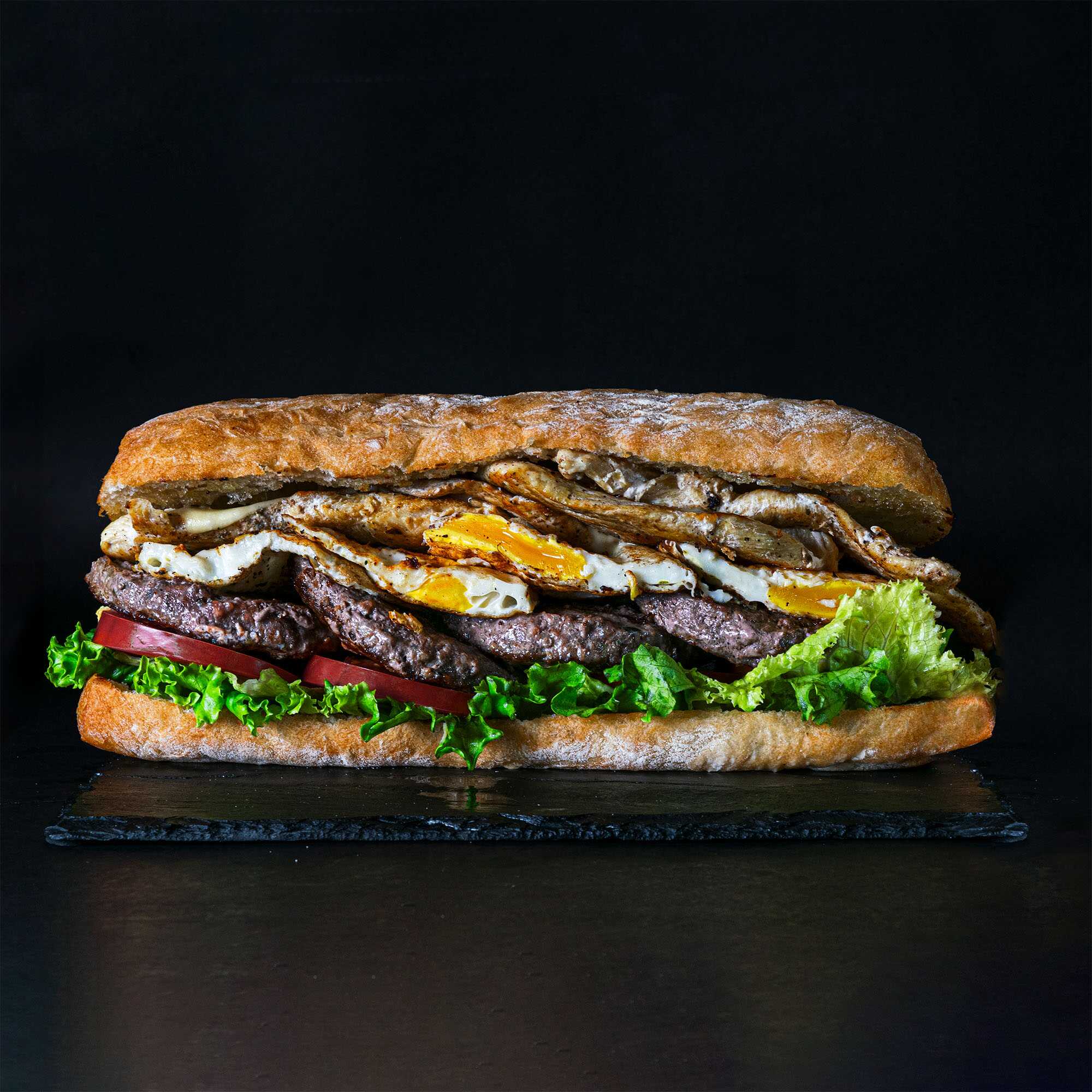 2 Hamburguesas carnívoro 150 g, servido en pan ciabatta de 25 cm, 2 filetes de pechuga, 2 quesos Edam, 2 huevos, lechuga y tomate, hasta 6 salsas al escoger, no lleva papas fritas.
