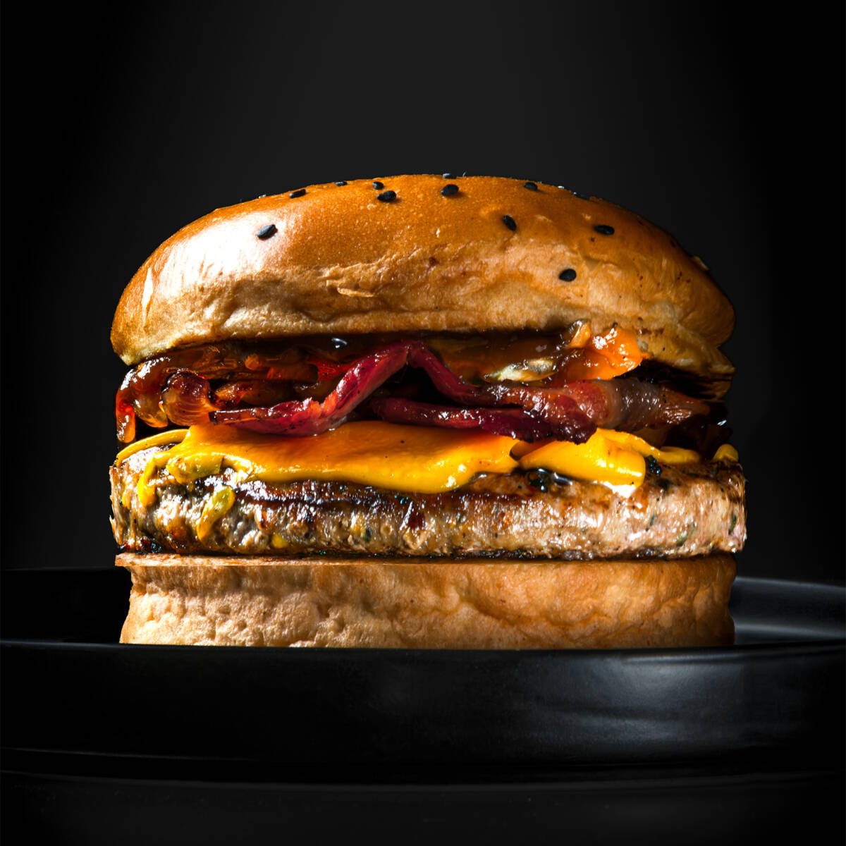 Pan Brioche, hamburguesa carnivoro 150gr. Doble queso cheddar, tocino ahumado, cebolla caramelizada oriental y salsa BBQ