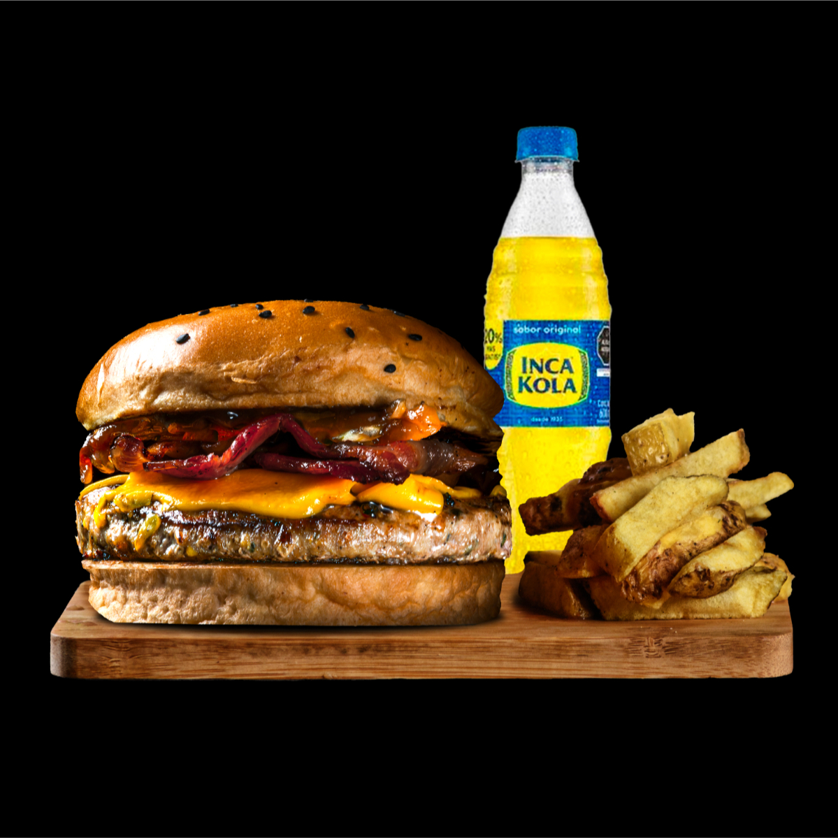 Pan Brioche, hamburguesa carnivoro 150gr. Doble queso cheddar, tocino ahumado, cebolla caramelizada oriental y salsa BBQ + papas nativas fritas + inca cola