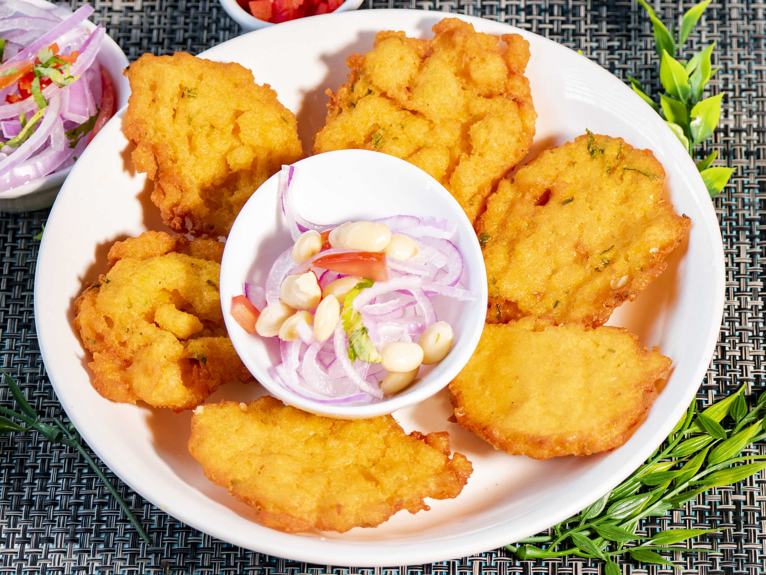 Cevichazo natural (sazonado con sal, limón, culantro y Ají limo) acompañado de tortitas de choclo,camote y sarandaja