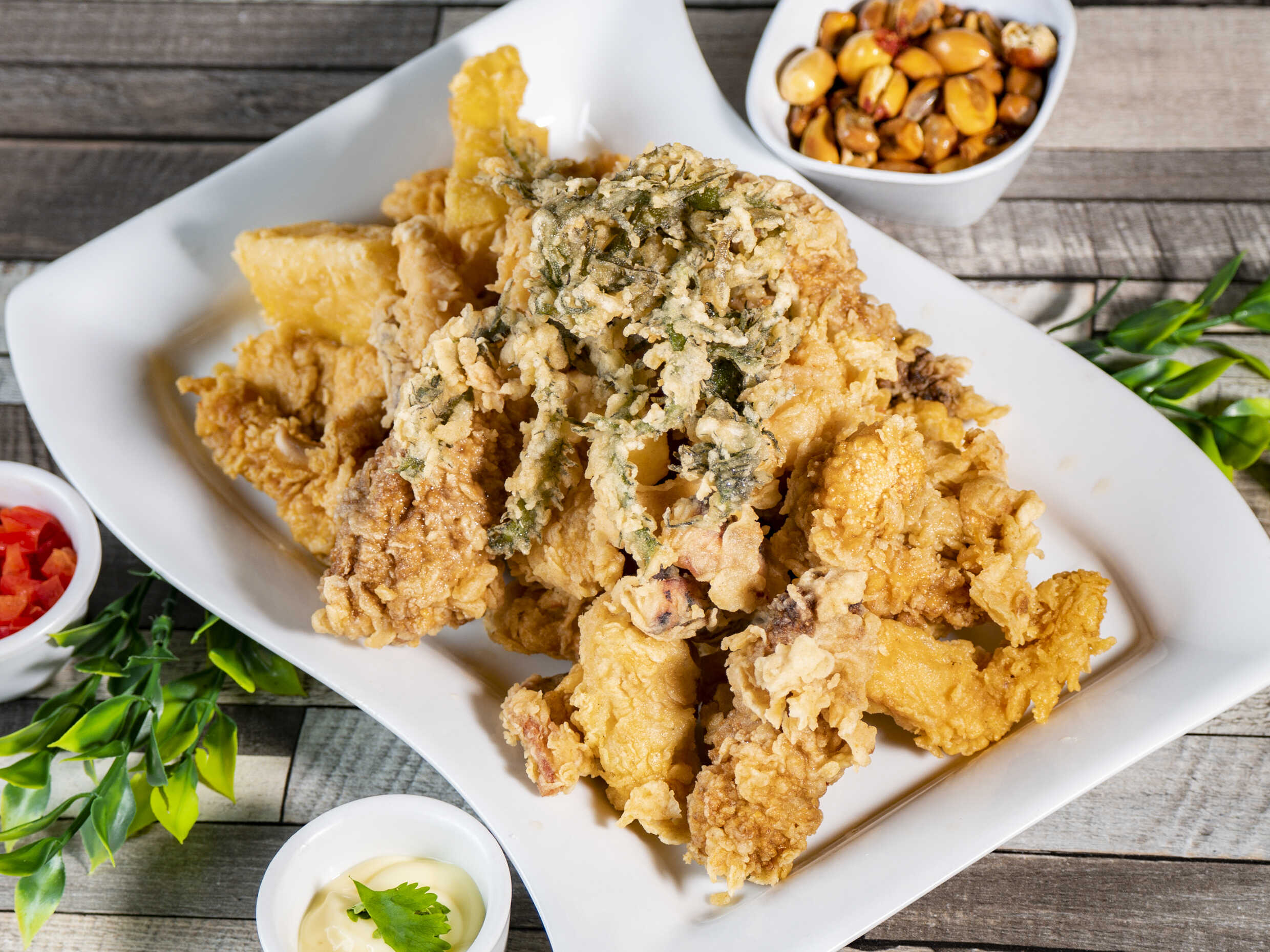 Mariscos, pescado y yuyo fritos con yucas y salsa criolla.
