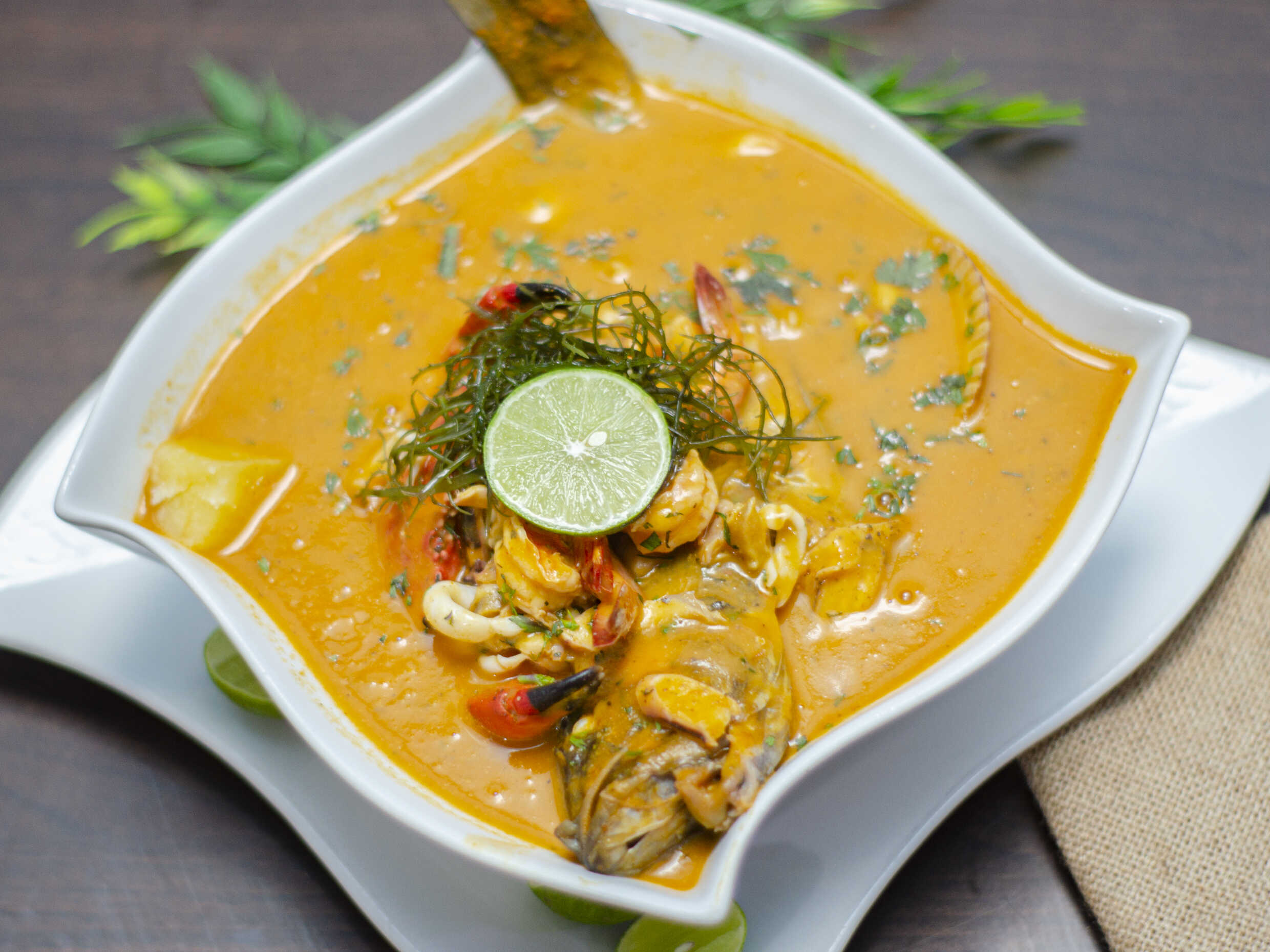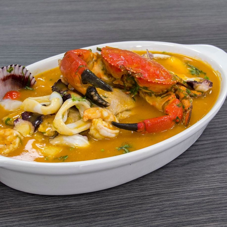 Sopa con filete de pescado, mariscos de estación y cangrejo. Arroz de cortesía.