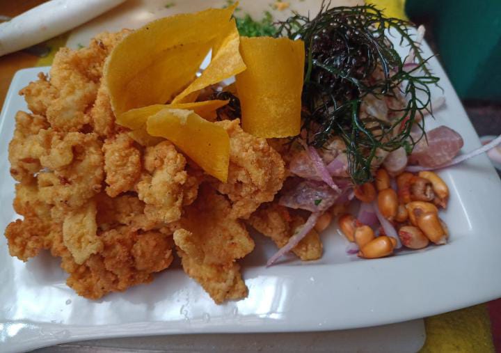 Chicharrón de pescado y chicharrón de pota más yuca frita.