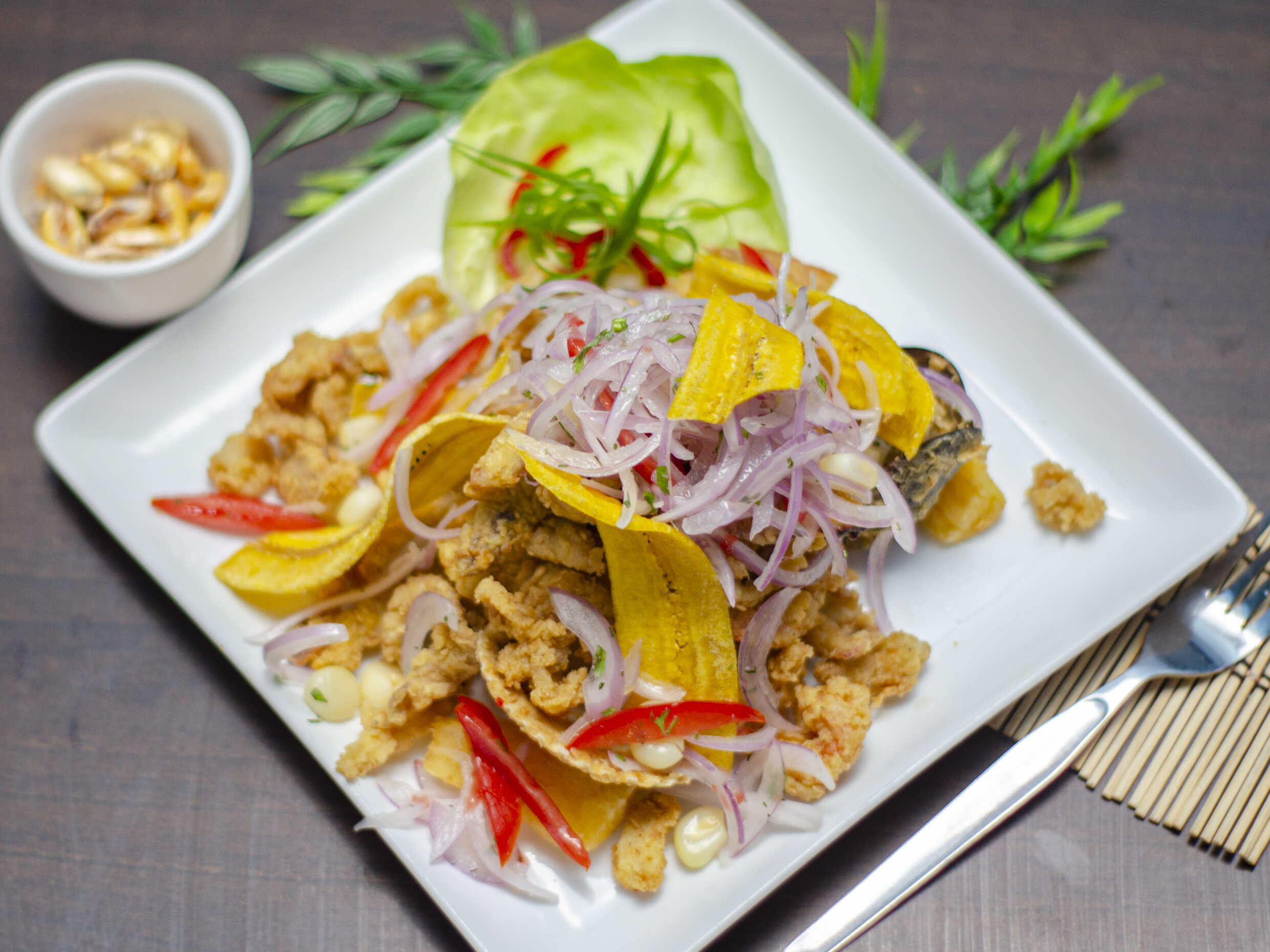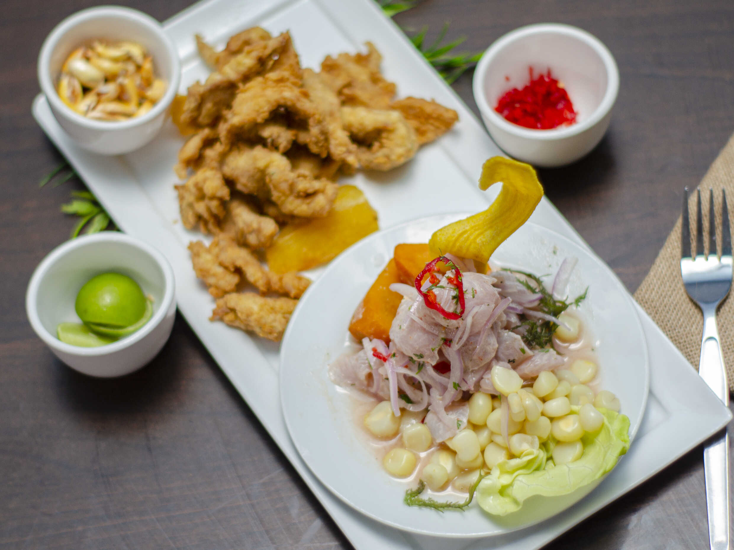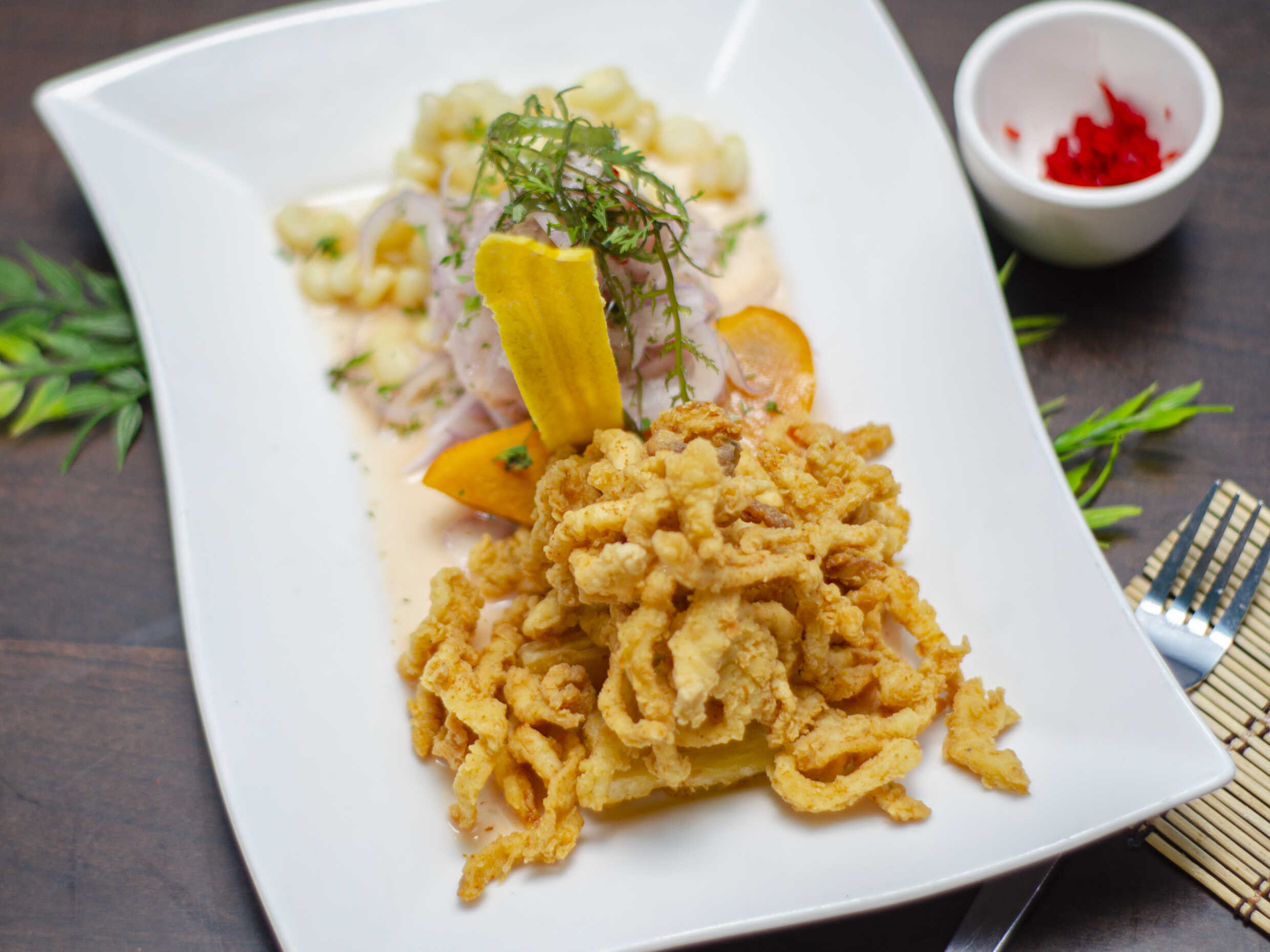 Ceviche de pescado acompañado de chicharrón de pota