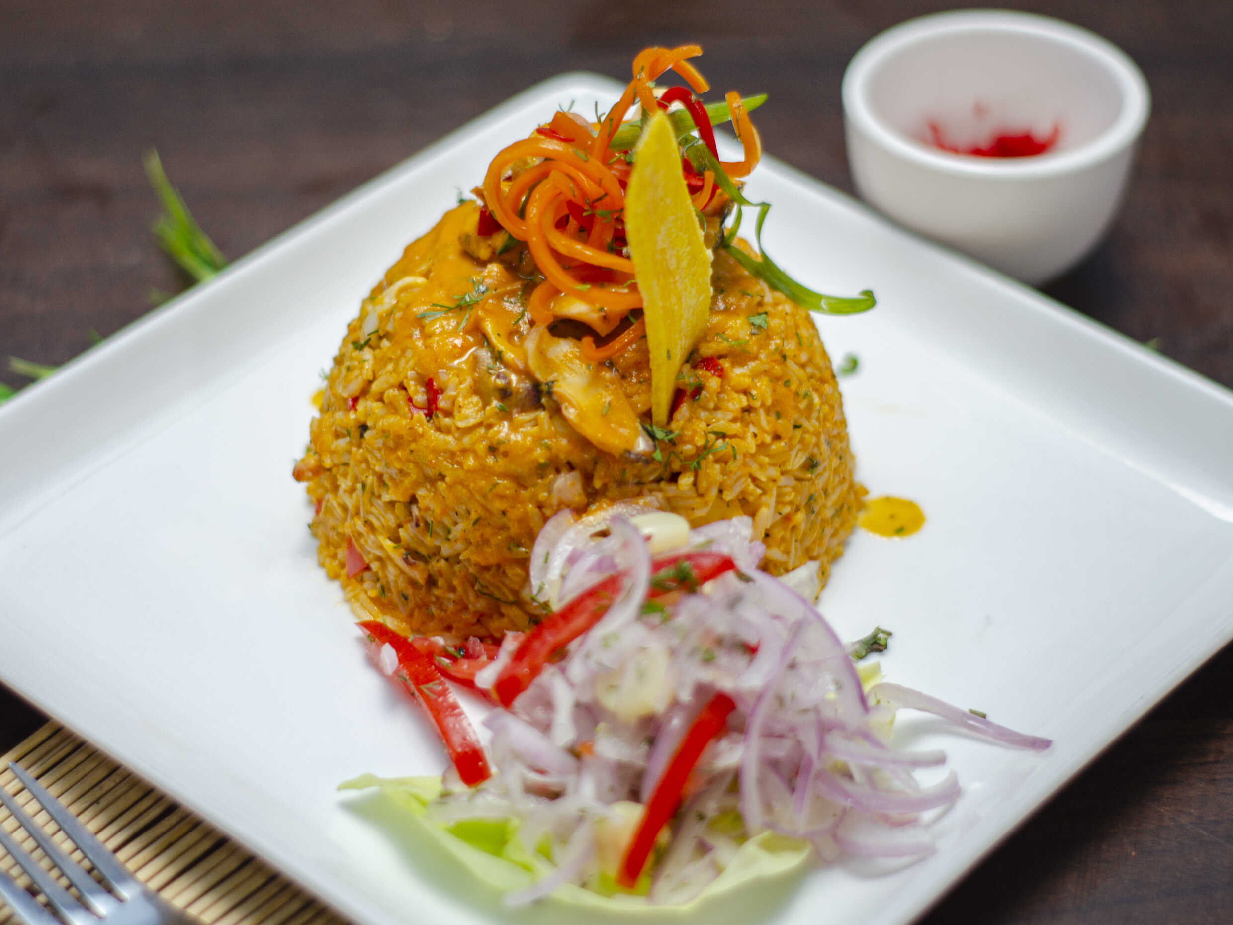 Arroz Chaufa de mariscos, ceviche de pescado y chicharrón de pota
