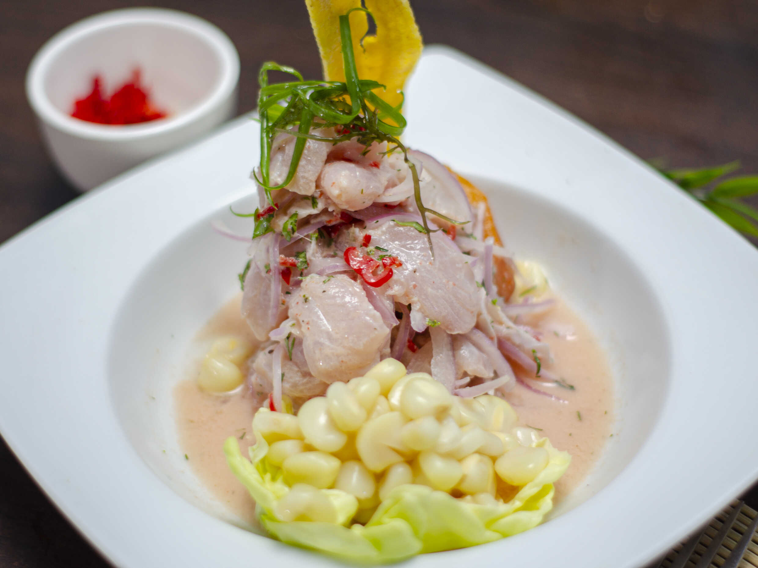 Trozos de pescado, maridado con limon ají, culantro, acompañado de camote, choclo y cancha.