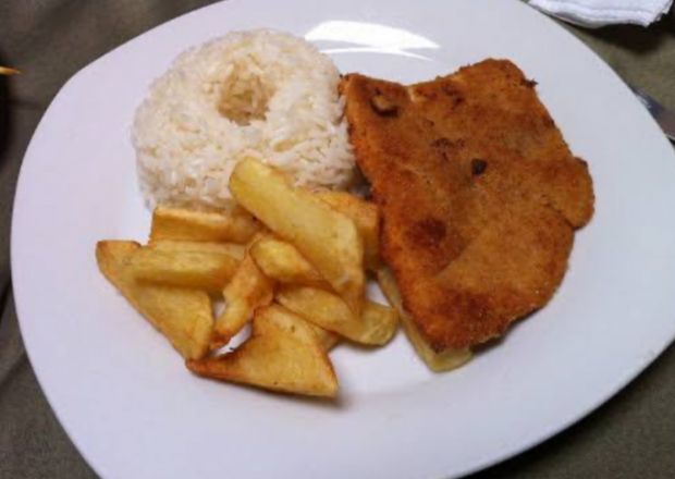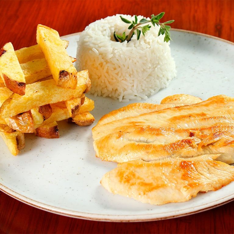 Filete de pollo acompañado de papas fritas y arroz blanco