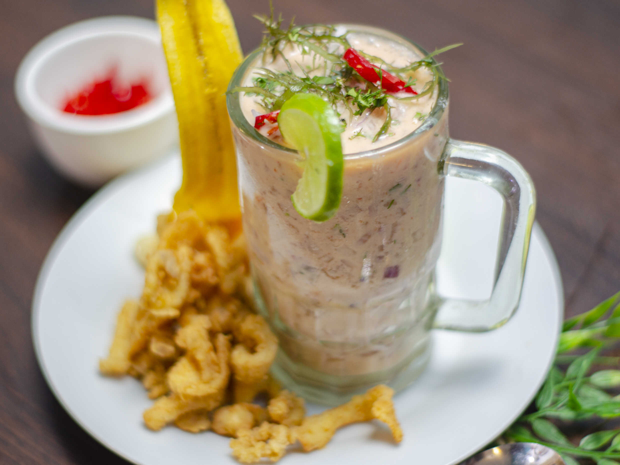 Porción de concentrado de pescado, leche de tigre, camote + limón